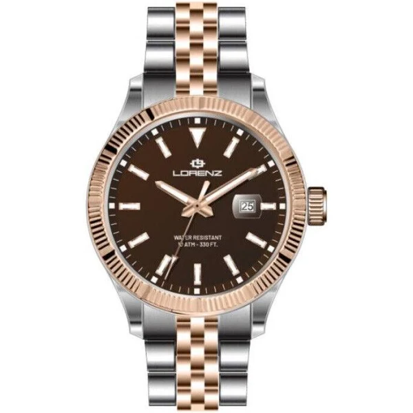 Orologio da uomo a quarzo marca Lorenz in Acciaio inossidabile con datario. Diametro Cassa: 41mm. Quadrante colore marrone. Cinturino in acciaio inossidabile bicolore acciaio e Rosè Marrone.