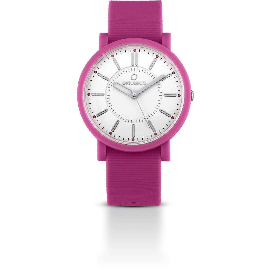 Orologio solo tempo di ops della collezione ops posh. Modello con cassa in policarbonato rotonda di colore fuxia, diametro cassa 38 mm, cassa ultrapiatta spessore 6 mm. Questo orologio ha indici, quadrante bianco e cinturino passante in gomma, intercambiabile. Modello resistente all’acqua 5atm e movimento al quarzo.