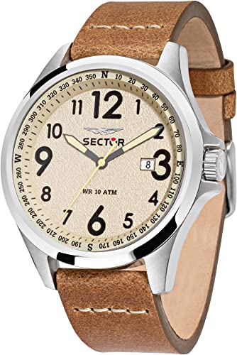 Orologio da uomo marca Sector. L’orologio è un solo tempo con tre lancette; ha la cassa in acciaio di color acciaio. Il quadrante è di colore sabbia e la forma della cassa rotonda, il diametro della cassa è di mm 45. Ha un cinturino in pelle di color marrone chiaro. Il movimento è: quarzo e presenta il datario. La resistenza dell’orologio è di atm 10.